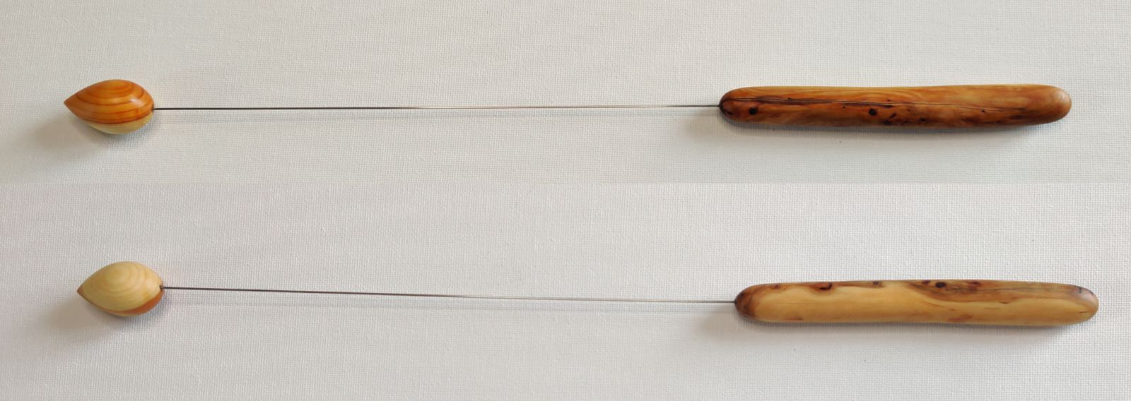 Kugel und Griff sind aus Eibenholz, der Draht besteht aus Federkernstahl, er wurde in Kugel und Griff eingefügt und mit Kunstharzkleber befestigt.