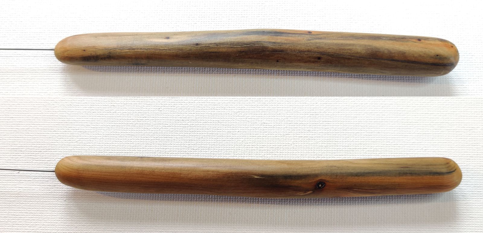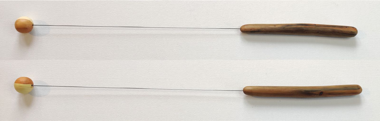 Kugel und Griff sind aus Eibenholz, der Draht besteht aus Federkernstahl, er wurde in Kugel und Griff eingefügt und mit Kunstharzkleber befestigt.