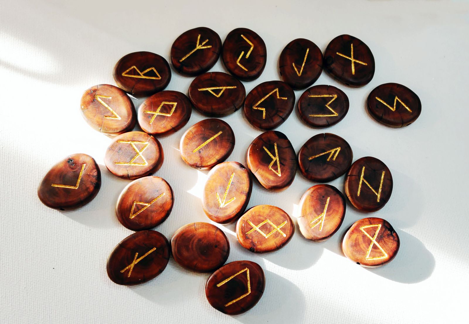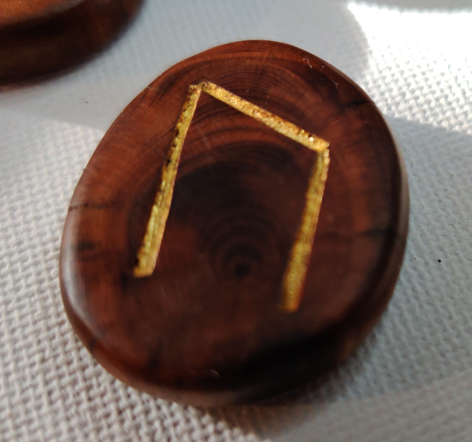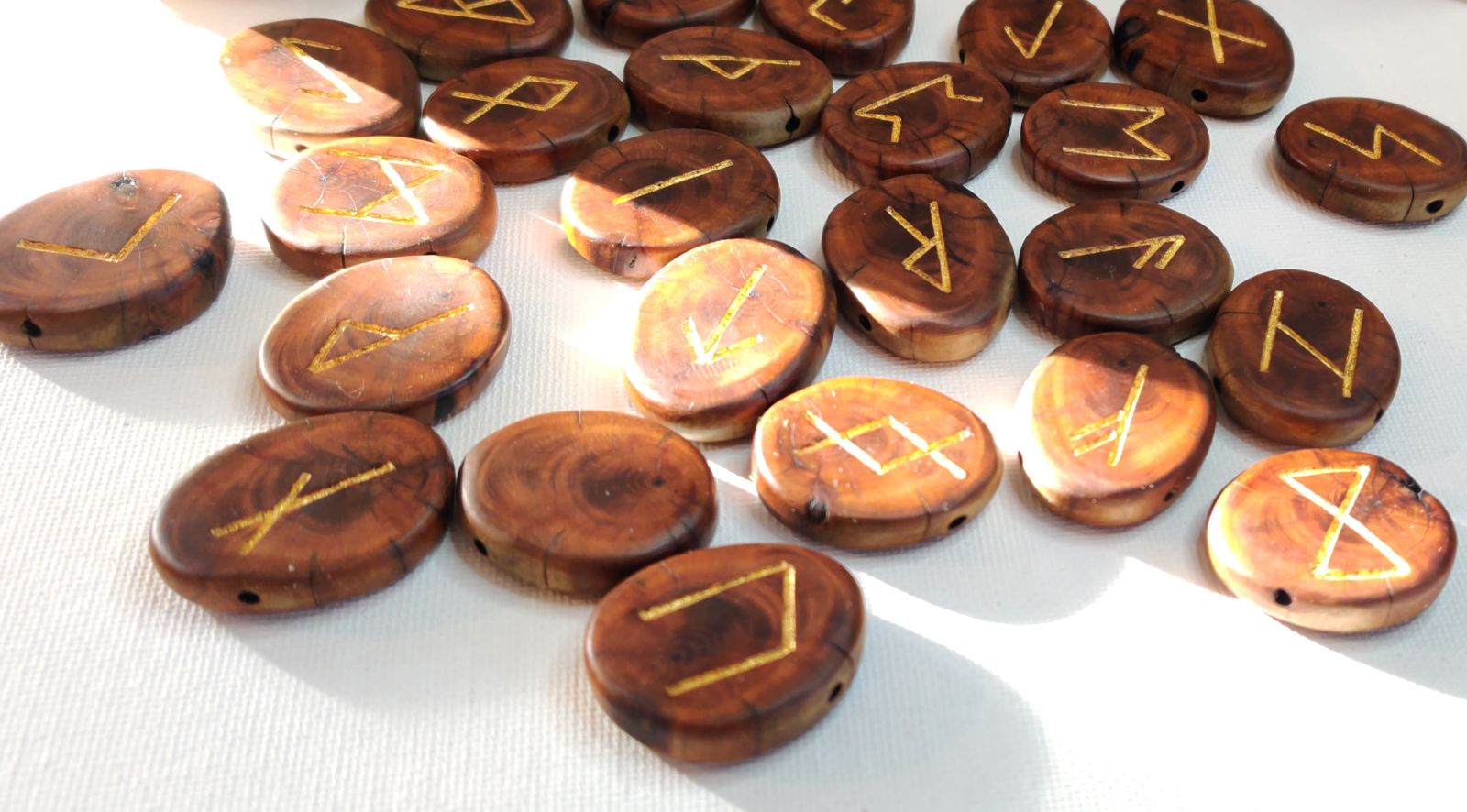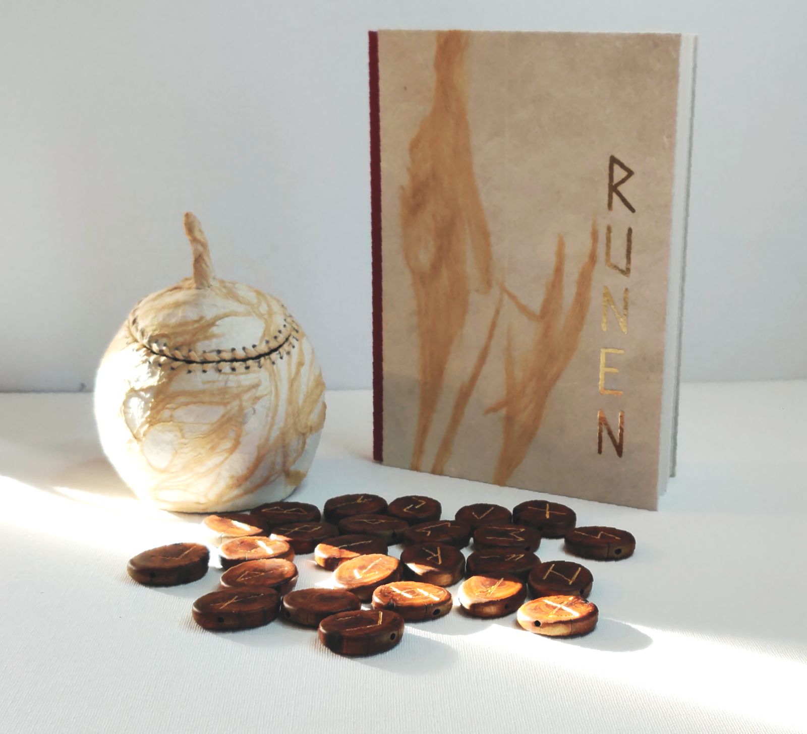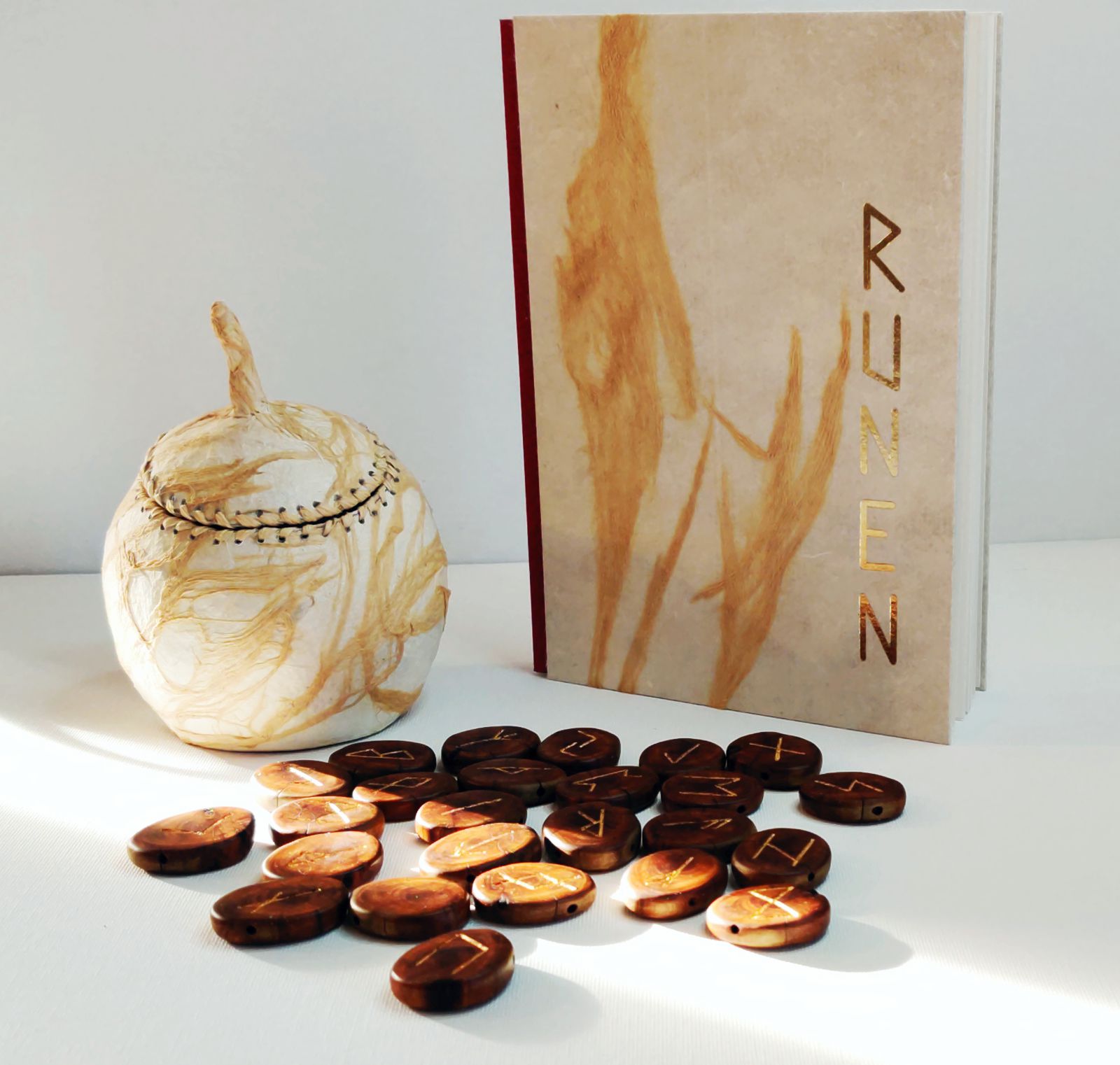 Das Runeset besteht aus 25 Astscheiben zusammenhängend aus einem alten Eibenast mit 24 eingefrästen Runenzeichen die mit Blattgold ausgelegt sind, und einer leeren Astscheibe. Jede Astscheibe ist durchbohrt, so dass man sie mit einem beigefügtem Lederband tragen kann.