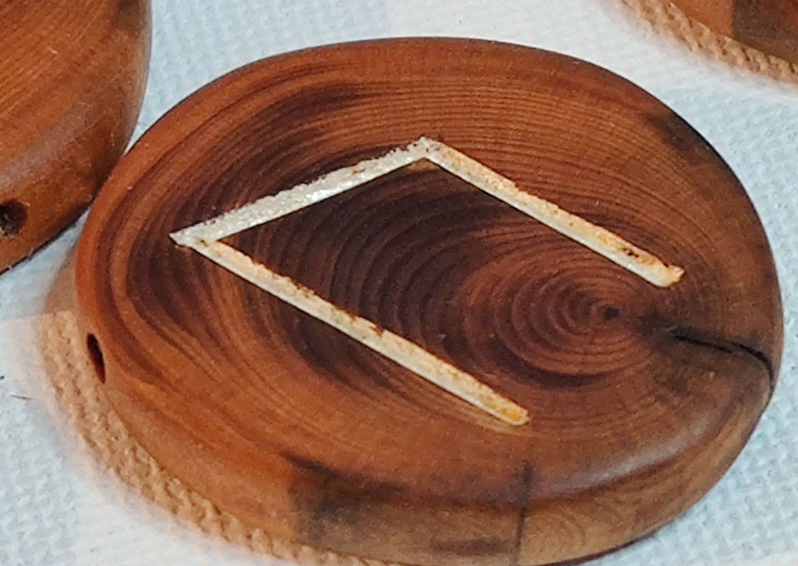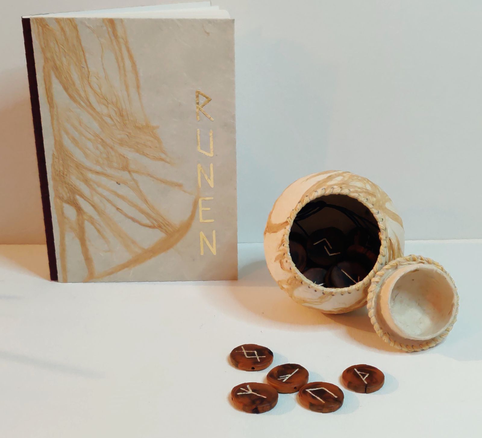 Das Runeset besteht aus 25 Astscheiben zusammenhängend aus einem Eibenast mit 24 eingefrästen Runenzeichen die mit Blattsilber ausgelegt sind und einer leeren Astscheibe. Jede Astscheibe ist durchbohrt, so dass man sie mit einem beigefügtem Lederband tragen kann.