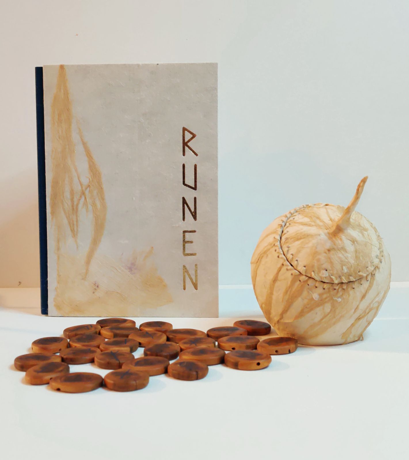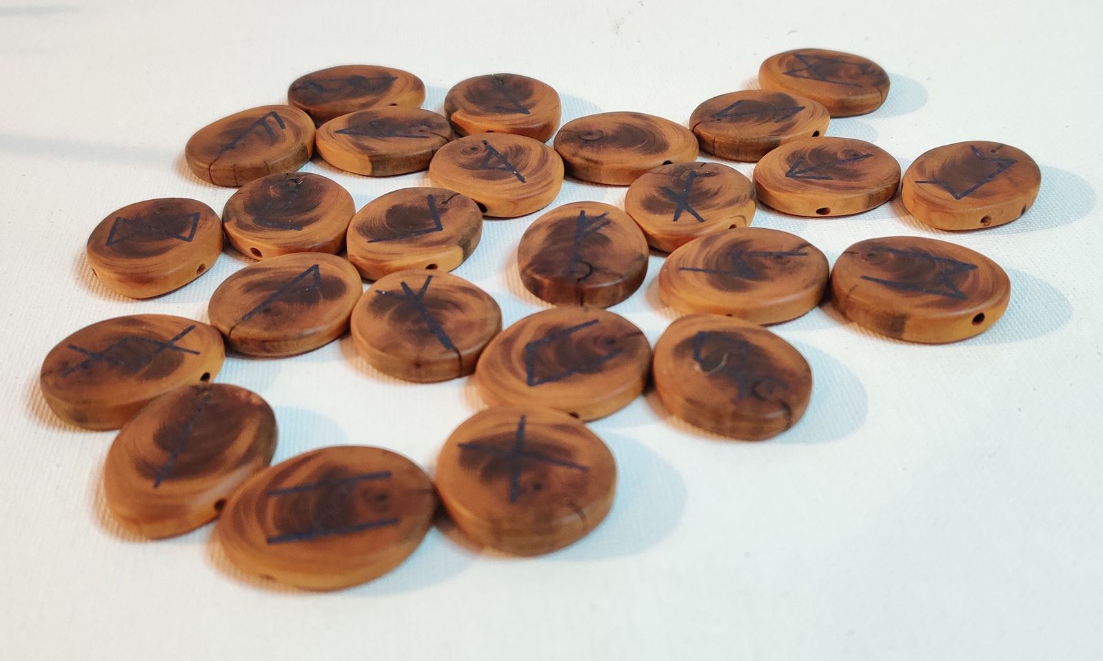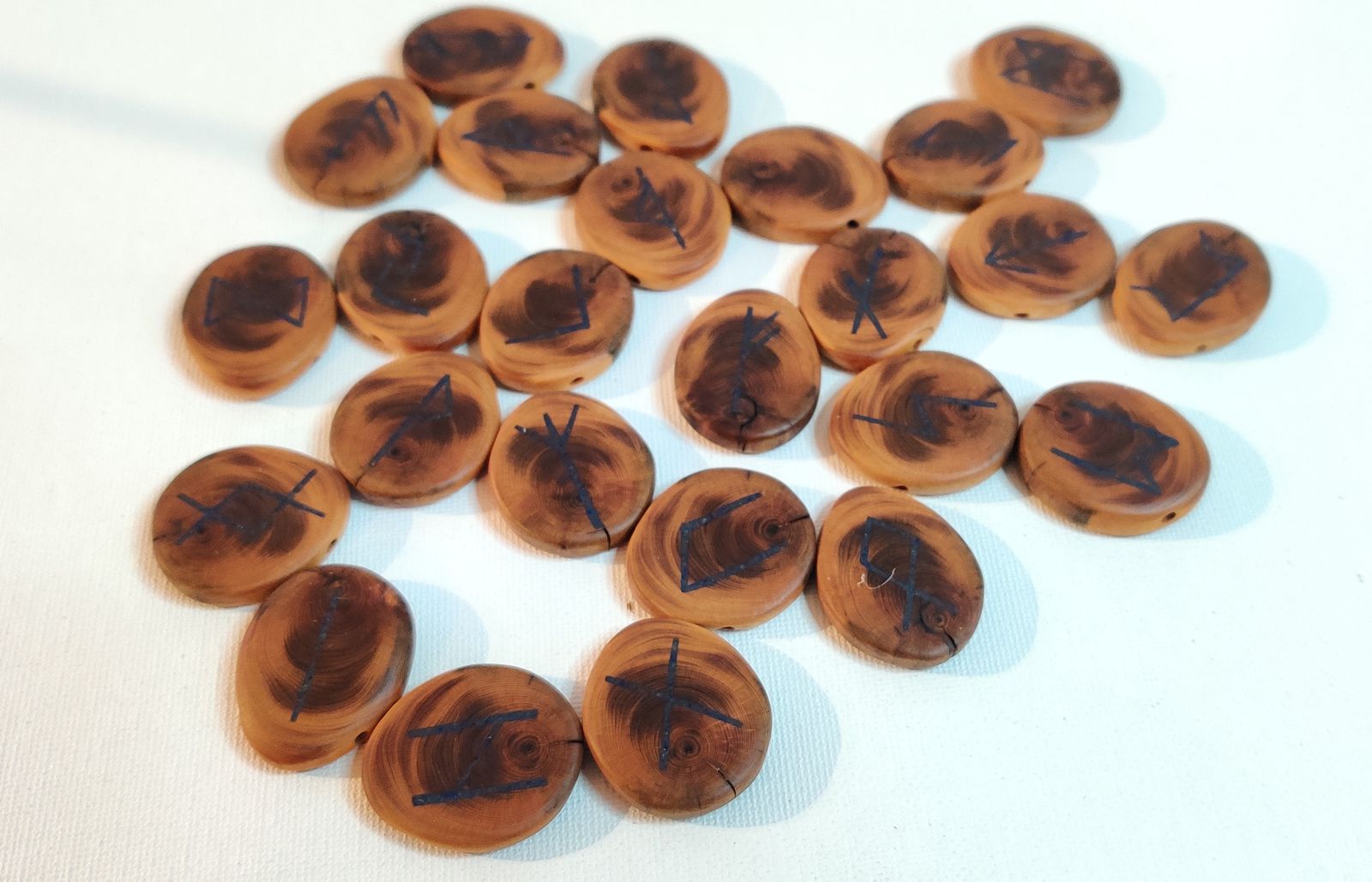 Das Runeset besteht aus 25 Astscheiben zusammenhängend aus einem Eibenast mit 24 eingefrästen Runenzeichen die mit pulverisiertem Lapislazuli gefüllt sind und einer leeren Astscheibe.